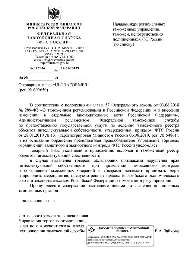 ПИСЬМО ФТС РФ от 16.03.2026 N 14-35/15139 "О ТОВАРНОМ ЗНАКЕ "ULTRAFORMER" (РЕГ. N 602650)"