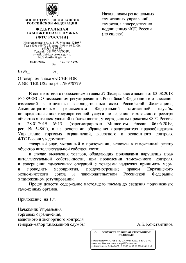 ПИСЬМО ФТС РФ от 18.03.2026 N 14-35/15976 "О ТОВАРНОМ ЗНАКЕ "NICHE FOR A BETTER US" ПО РЕГ. N 970779"