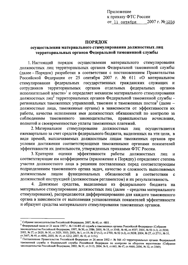 ПРИКАЗ ФТС РФ от 11.10.2007 N 1258 "ОБ УТВЕРЖДЕНИИ ПОРЯДКА ОСУЩЕСТВЛЕНИЯ МАТЕРИАЛЬНОГО СТИМУЛИРОВАНИЯ ДОЛЖНОСТНЫХ ЛИЦ ТЕРРИТОРИАЛЬНЫХ ОРГАНОВ ФЕДЕРАЛЬНОЙ ТАМОЖЕННОЙ СЛУЖБЫ" (Зарегистрировано в Минюсте РФ 17.10.2007 N 10339)