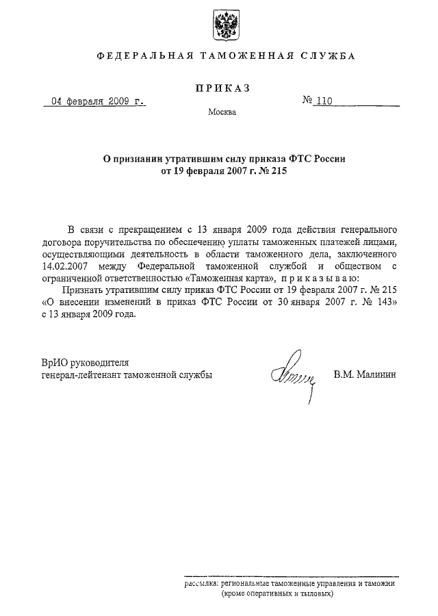ПРИКАЗ ФТС РФ от 04.02.2009 N 110 "О ПРИЗНАНИИ УТРАТИВШИМ СИЛУ ПРИКАЗА ФТС РОССИИ ОТ 19 ФЕВРАЛЯ 2007 Г. N 215"