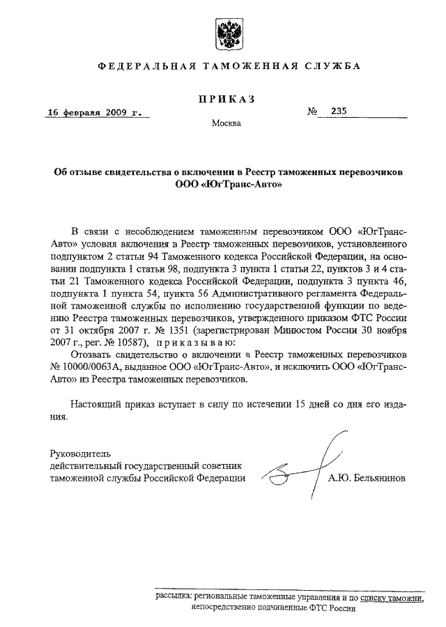 "ОБ ОТЗЫВЕ СВИДЕТЕЛЬСТВА О ВКЛЮЧЕНИИ В РЕЕСТР ТАМОЖЕННЫХ ПЕРЕВОЗЧИКОВ ООО "ЮГТРАНС - АВТО"