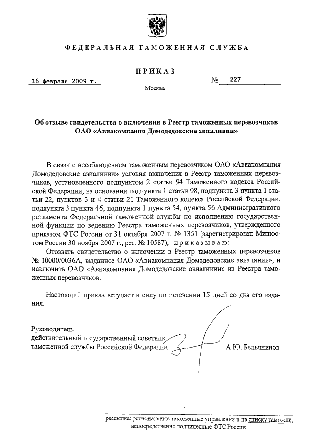 "ОБ ОТЗЫВЕ СВИДЕТЕЛЬСТВА О ВКЛЮЧЕНИИ В РЕЕСТР ТАМОЖЕННЫХ ПЕРЕВОЗЧИКОВ ОАО "АВИАКОМПАНИЯ ДОМОДЕДОВСКИЕ АВИАЛИНИИ"