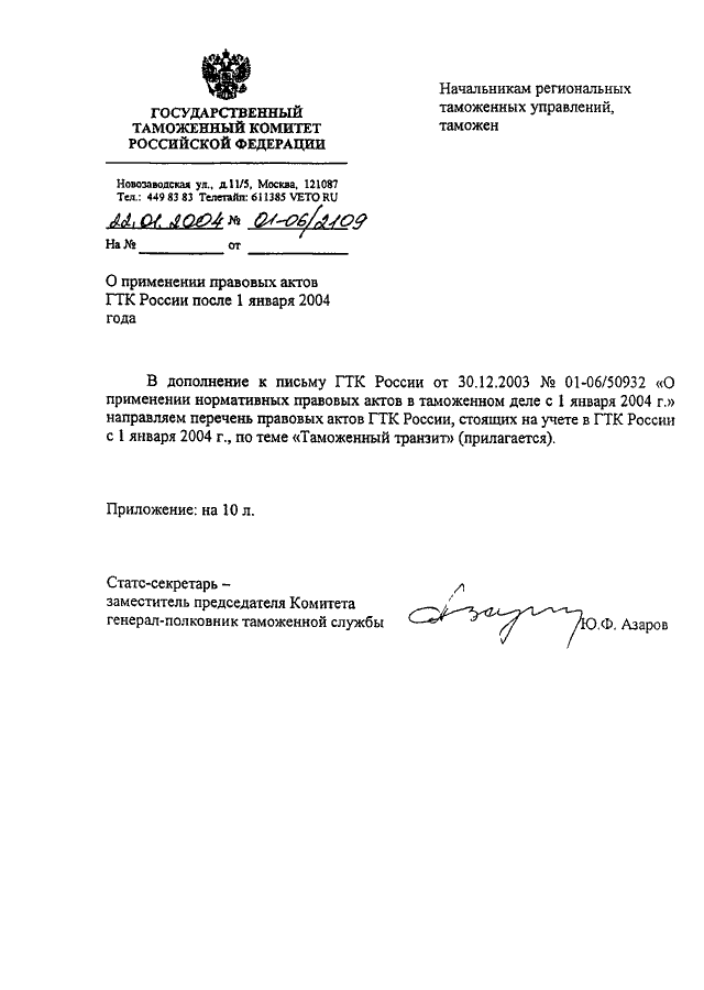 ПИСЬМО ГТК РФ от 22.01.2004 N 01-06/2109