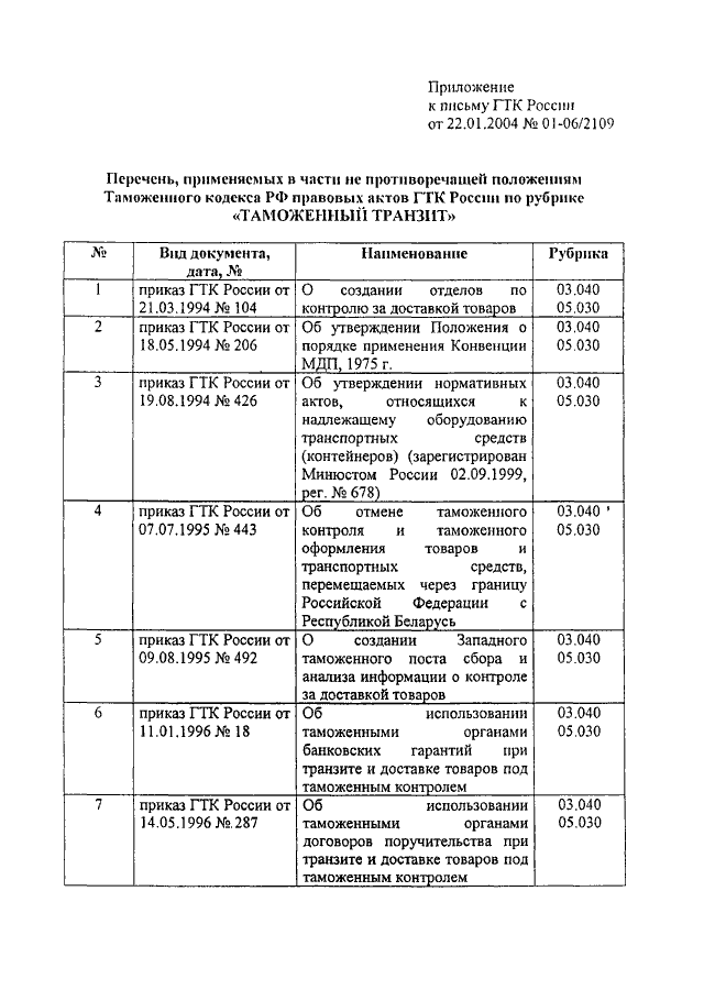 ПИСЬМО ГТК РФ от 22.01.2004 N 01-06/2109