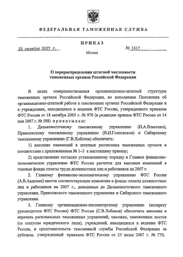 ПРИКАЗ ФТС РФ от 25.10.2007 N 1317