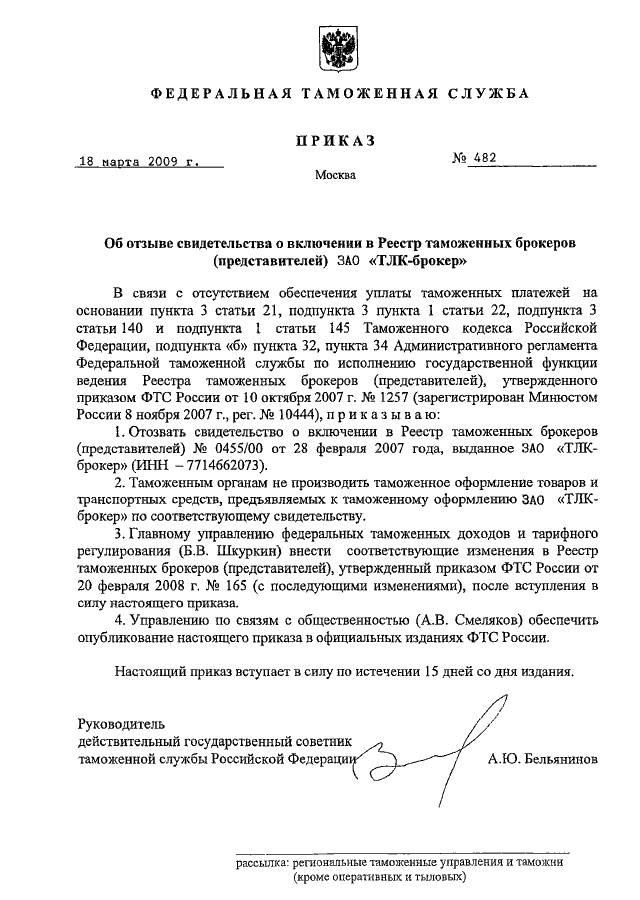"ОБ ОТЗЫВЕ СВИДЕТЕЛЬСТВА О ВКЛЮЧЕНИИ В РЕЕСТР ТАМОЖЕННЫХ БРОКЕРОВ (ПРЕДСТАВИТЕЛЕЙ) ЗАО "ТЛК-БРОКЕР"