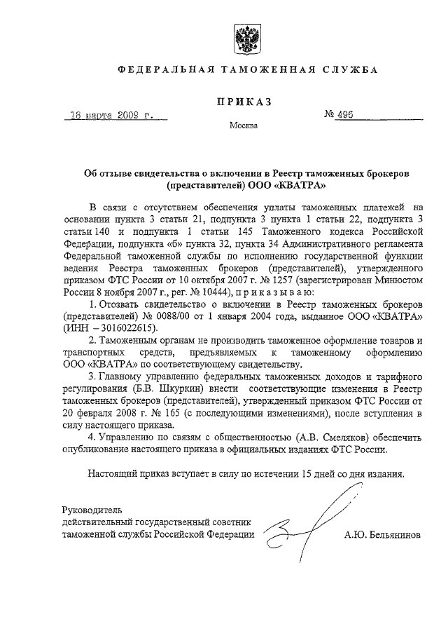 "ОБ ОТЗЫВЕ СВИДЕТЕЛЬСТВА О ВКЛЮЧЕНИИ В РЕЕСТР ТАМОЖЕННЫХ БРОКЕРОВ (ПРЕДСТАВИТЕЛЕЙ) ООО "КВАТРА"