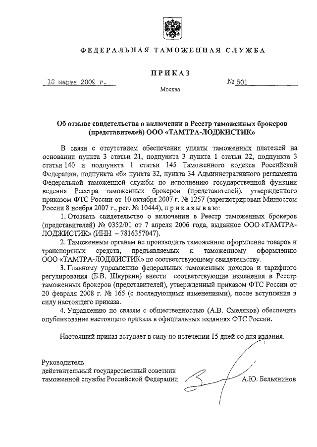 "ОБ ОТЗЫВЕ СВИДЕТЕЛЬСТВА О ВКЛЮЧЕНИИ В РЕЕСТР ТАМОЖЕННЫХ БРОКЕРОВ (ПРЕДСТАВИТЕЛЕЙ) ООО "ТАМТРА-ЛОДЖИСТИК"