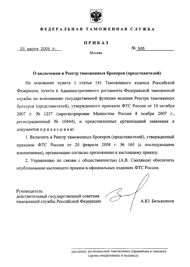 ПРИКАЗ ФТС РФ от 26.03.2009 N 566
