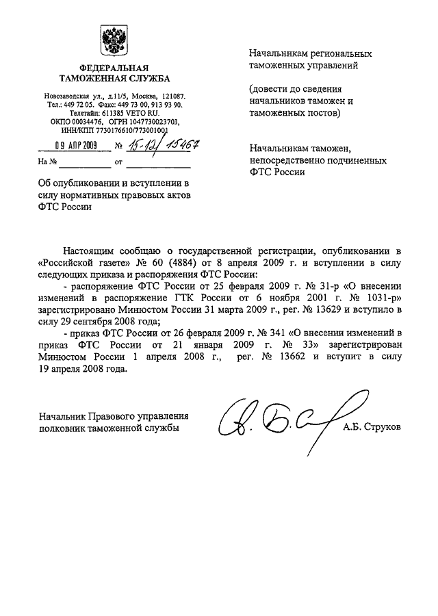 "ОБ ОПУБЛИКОВАНИИ И ВСТУПЛЕНИИ В СИЛУ НОРМАТИВНЫХ ПРАВОВЫХ АКТОВ ФТС РОССИИ"