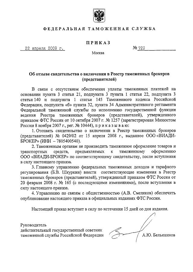 "ОБ ОТЗЫВЕ СВИДЕТЕЛЬСТВА О ВКЛЮЧЕНИИ В РЕЕСТР ТАМОЖЕННЫХ БРОКЕРОВ (ПРЕДСТАВИТЕЛЕЙ)"