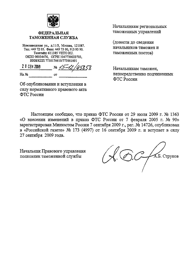 "ОБ ОПУБЛИКОВАНИИ И ВСТУПЛЕНИИ В СИЛУ НОРМАТИВНОГО ПРАВОВОГО АКТА ФТС РОССИИ"
