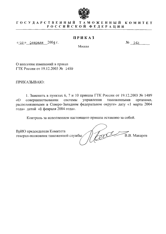 "О ВНЕСЕНИИ ИЗМЕНЕНИЙ В ПРИКАЗ ГТК РОССИИ ОТ 19.12.2003 N 1489"