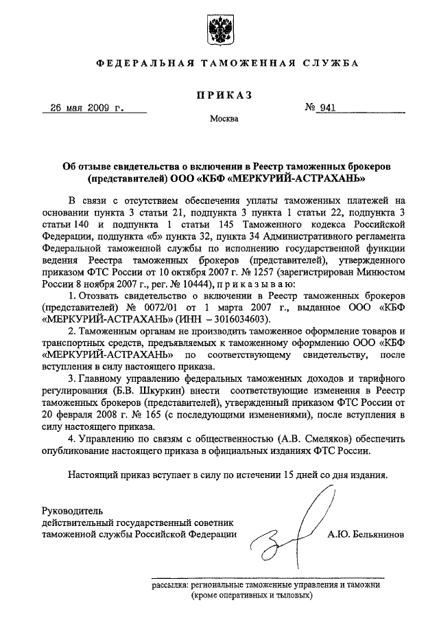"ОБ ОТЗЫВЕ СВИДЕТЕЛЬСТВА О ВКЛЮЧЕНИИ В РЕЕСТР ТАМОЖЕННЫХ БРОКЕРОВ (ПРЕДСТАВИТЕЛЕЙ) ООО "КБФ "МЕРКУРИЙ-АСТРАХАНЬ"