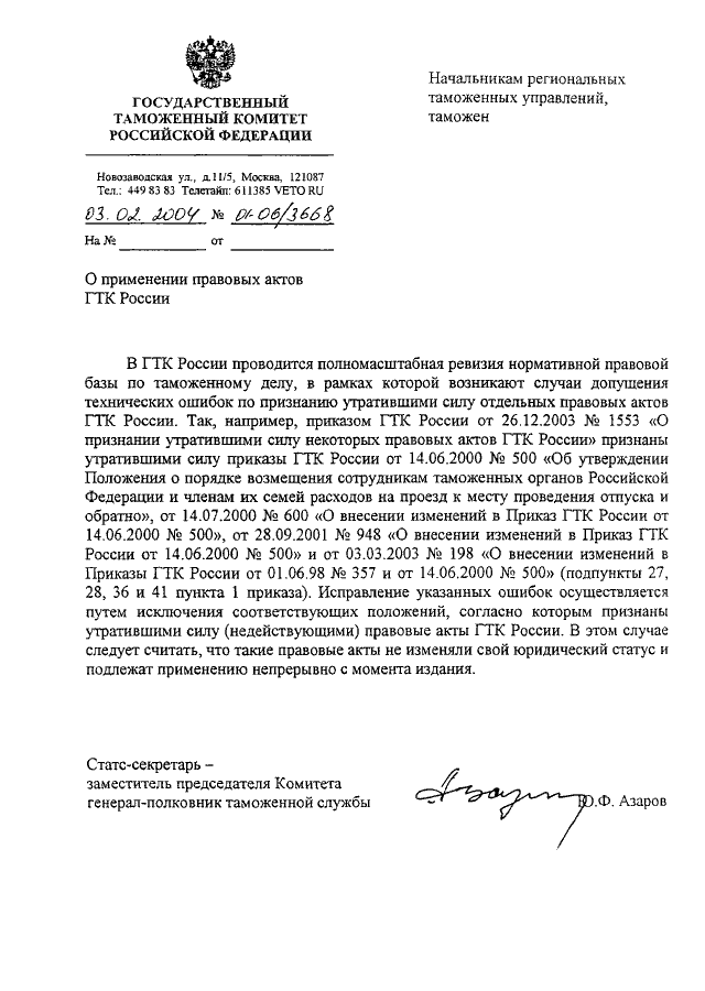 ПИСЬМО ГТК РФ от 03.02.2004 N 01-06/3668