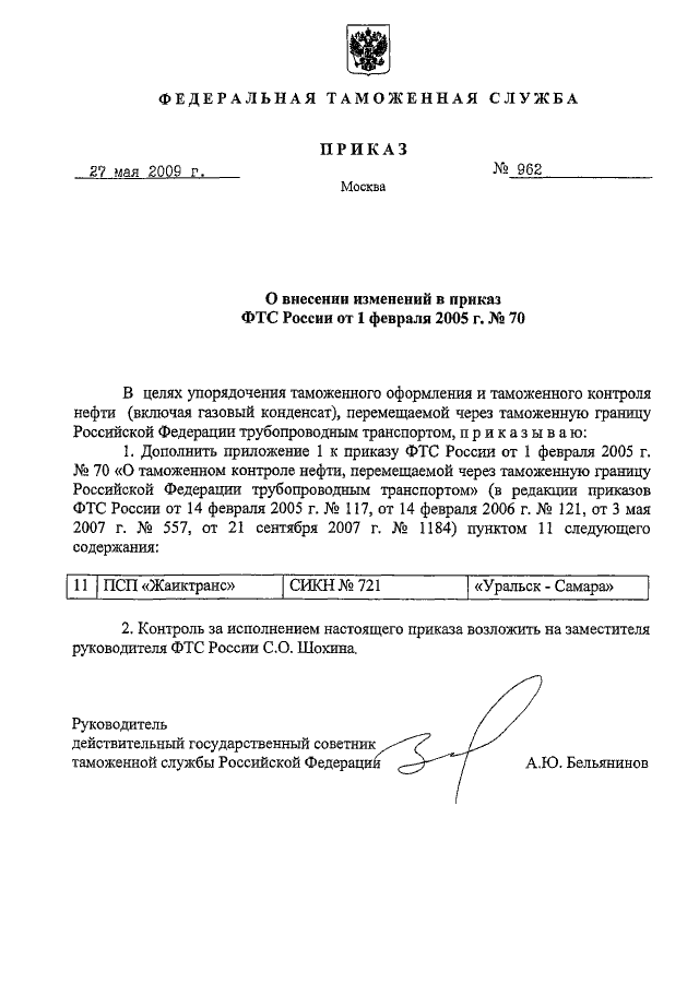 ПРИКАЗ ФТС РФ от 27.05.2009 N 962