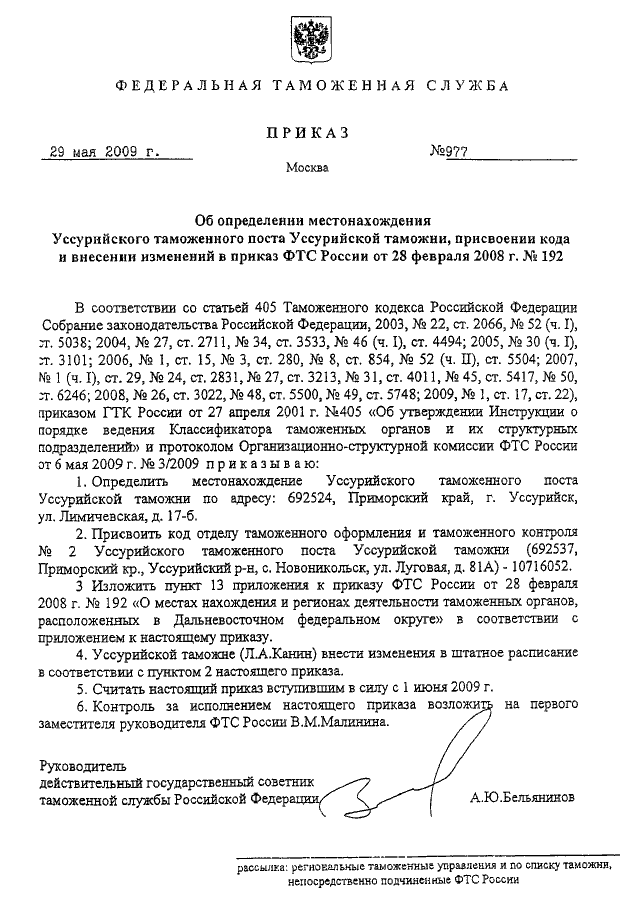 ПРИКАЗ ФТС РФ от 29.05.2009 N 977