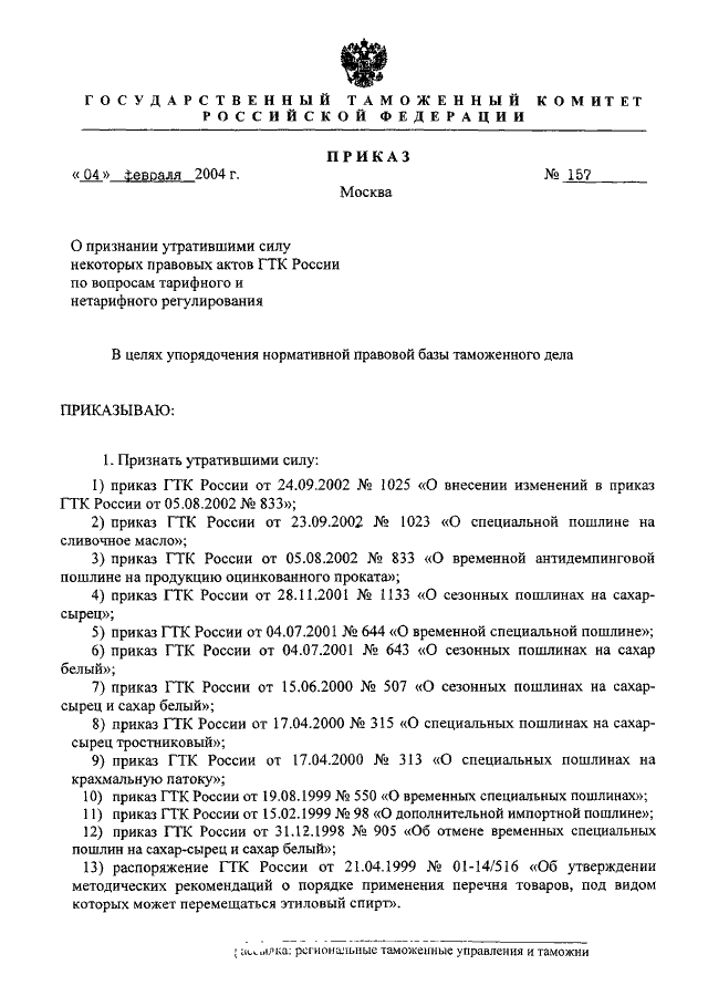 ПРИКАЗ ГТК РФ от 04.02.2004 N 157