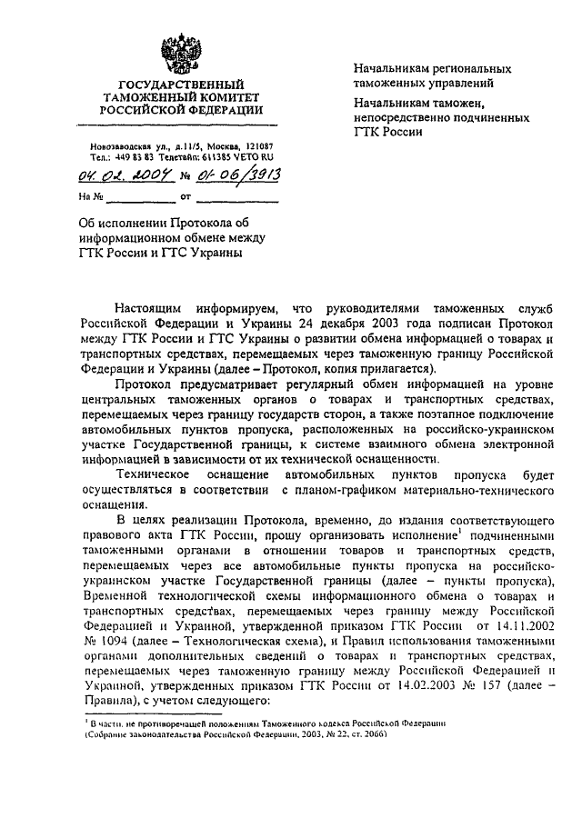 "ОБ ИСПОЛНЕНИИ ПРОТОКОЛА ОБ ИНФОРМАЦИОННОМ ОБМЕНЕ МЕЖДУ ГТК РОССИИ И ГТС УКРАИНЫ"