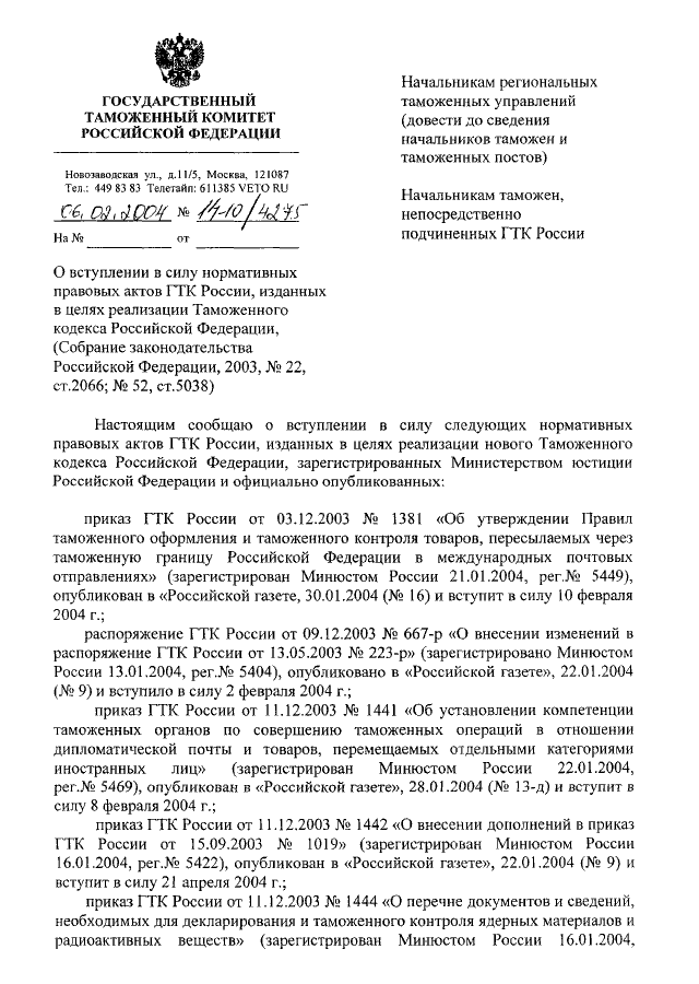 ПИСЬМО ГТК РФ от 06.02.2004 N 14-10/4275 "О ВСТУПЛЕНИИ В СИЛУ НОРМАТИВНЫХ ПРАВОВЫХ АКТОВ ГТК РОССИИ,