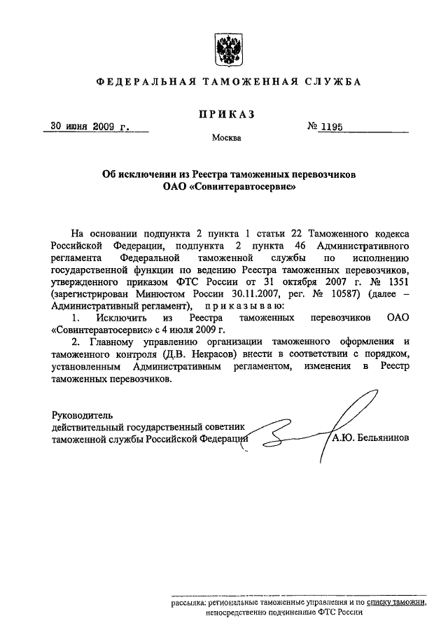 ПРИКАЗ ФТС РФ от 30.06.2009 N 1195