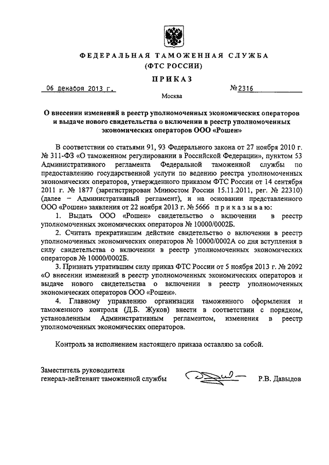 "О ВНЕСЕНИИ ИЗМЕНЕНИЙ В РЕЕСТР УПОЛНОМОЧЕННЫХ ЭКОНОМИЧЕСКИХ ОПЕРАТОРОВ И ВЫДАЧЕ НОВОГО СВИДЕТЕЛЬСТВА О ВКЛЮЧЕНИИ В РЕЕСТР УПОЛНОМОЧЕННЫХ ЭКОНОМИЧЕСКИХ ОПЕРАТОРОВ ООО "РОШЕН"