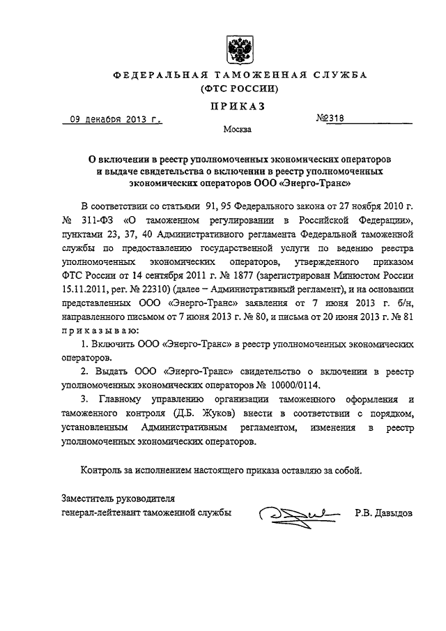 "О ВКЛЮЧЕНИИ В РЕЕСТР УПОЛНОМОЧЕННЫХ ЭКОНОМИЧЕСКИХ ОПЕРАТОРОВ И ВЫДАЧЕ СВИДЕТЕЛЬСТВА О ВКЛЮЧЕНИИ В РЕЕСТР УПОЛНОМОЧЕННЫХ ЭКОНОМИЧЕСКИХ ОПЕРАТОРОВ ООО "ЭНЕРГО-ТРАНС"