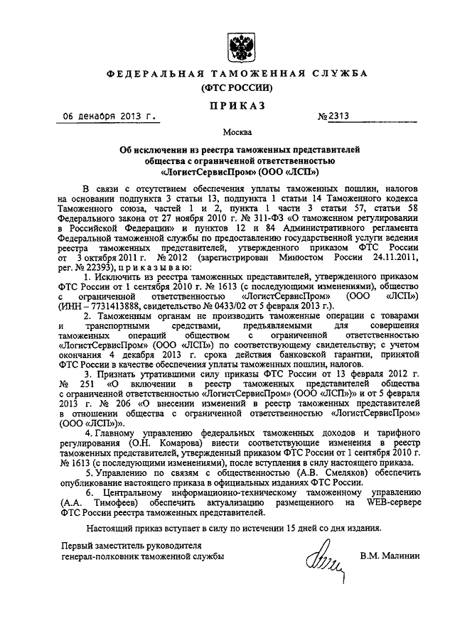"ОБ ИСКЛЮЧЕНИИ ИЗ РЕЕСТРА ТАМОЖЕННЫХ ПРЕДСТАВИТЕЛЕЙ ОБЩЕСТВА С ОГРАНИЧЕННОЙ ОТВЕТСТВЕННОСТЬЮ "ЛОГИСТСЕРВИСПРОМ" (ООО "ЛСП")"