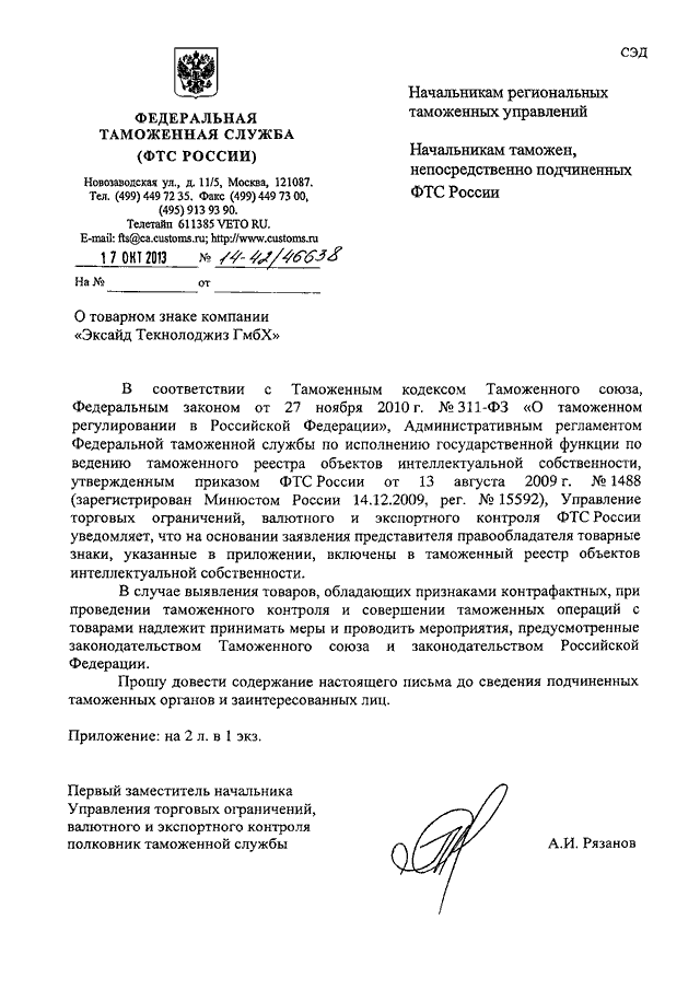 ПИСЬМО ФТС РФ от 17.10.2013 N 14-42/46638