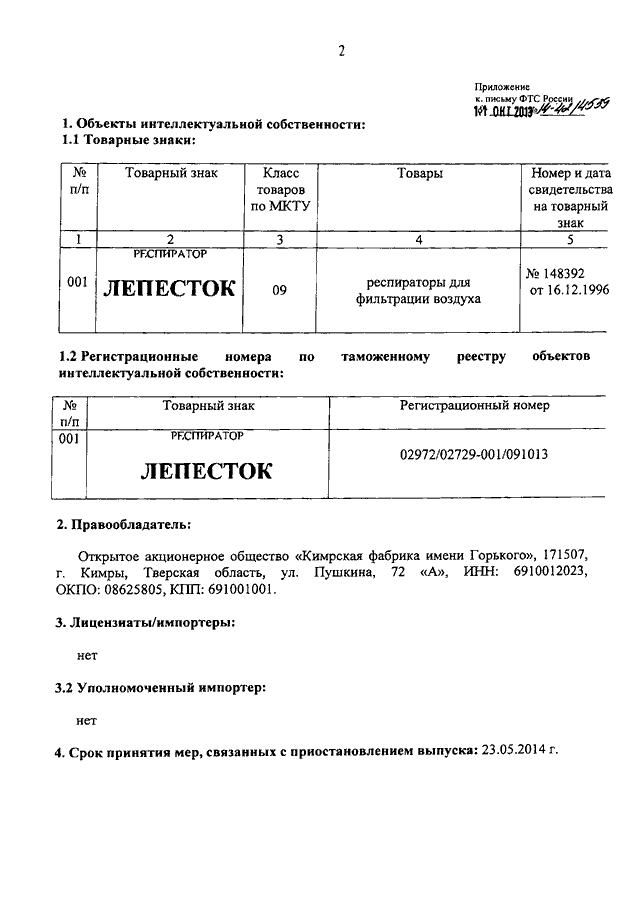 "О ТОВАРНОМ ЗНАКЕ "РЕСПИРАТОР ЛЕПЕСТОК" КИМРСКОЙ ФАБРИКИ ИМ. ГОРЬКОГО"