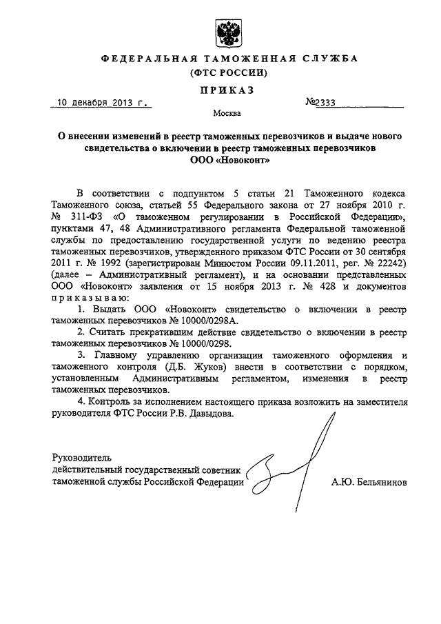 ПРИКАЗ ФТС РФ от 10.12.2013 N 2333