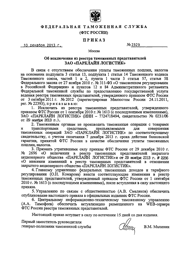 "ОБ ИСКЛЮЧЕНИИ ИЗ РЕЕСТРА ТАМОЖЕННЫХ ПРЕДСТАВИТЕЛЕЙ ЗАО "ПАРКЛАЙН ЛОГИСТИК"