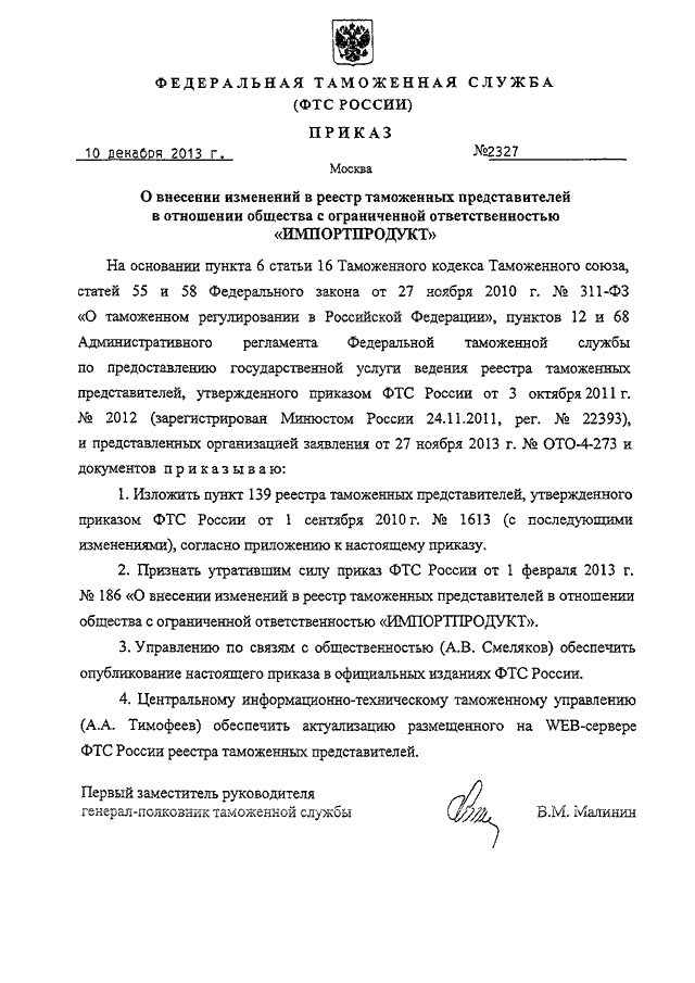 ПРИКАЗ ФТС РФ от 10.12.2013 N 2327