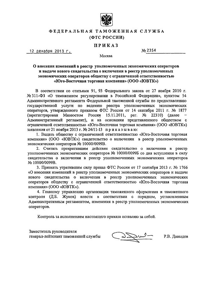 ПРИКАЗ ФТС РФ от 12.12.2013 N 2354 "О ВНЕСЕНИИ ИЗМЕНЕНИЙ В РЕЕСТР УПОЛНОМОЧЕННЫХ ЭКОНОМИЧЕСКИХ