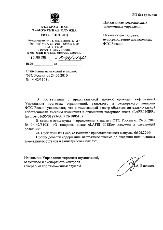 "О ВНЕСЕНИИ ИЗМЕНЕНИЙ В ПИСЬМО ФТС РОССИИ ОТ 24.06.2010 N 14-42/31031"