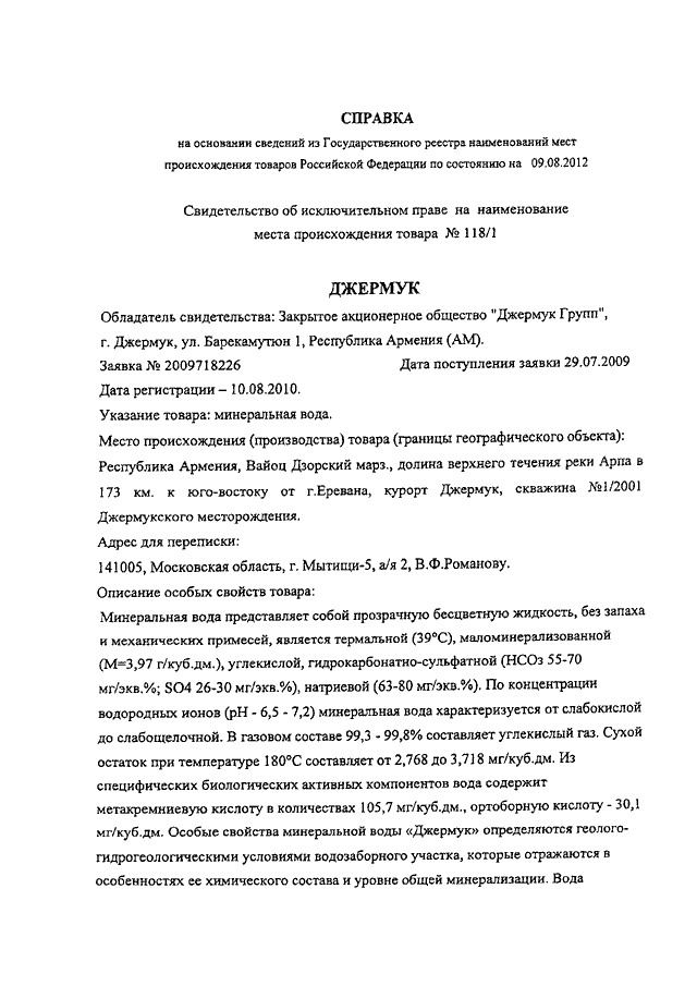 "О НАИМЕНОВАНИИ МЕСТА ПРОИСХОЖДЕНИЯ ТОВАРА "ДЖЕРМУК"