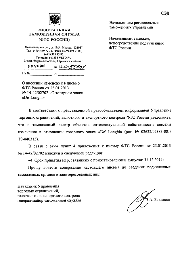 "О ВНЕСЕНИИ ИЗМЕНЕНИЙ В ПИСЬМО ФТС РОССИИ ОТ 25.01.2013 N 14-42/02702 "О ТОВАРНОМ ЗНАКЕ "DE LONGHI"