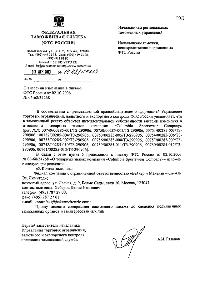 "О ВНЕСЕНИИ ИЗМЕНЕНИЙ В ПИСЬМО ФТС РОССИИ ОТ 02.10.2006 N 06-68/34268"