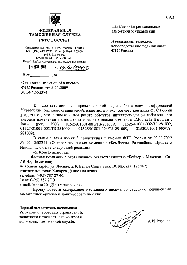 "О ВНЕСЕНИИ ИЗМЕНЕНИЙ В ПИСЬМО ФТС РОССИИ ОТ 03.11.2009 N 14-42/52374"