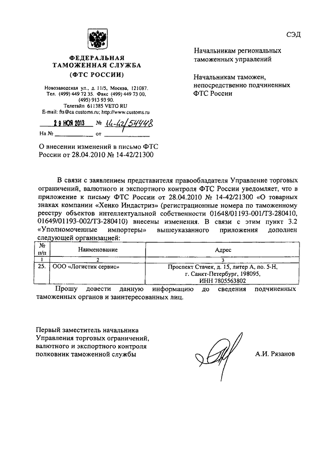 "О ВНЕСЕНИИ ИЗМЕНЕНИЙ В ПИСЬМО ФТС РОССИИ ОТ 28.04.2010 N 14-42/21300"