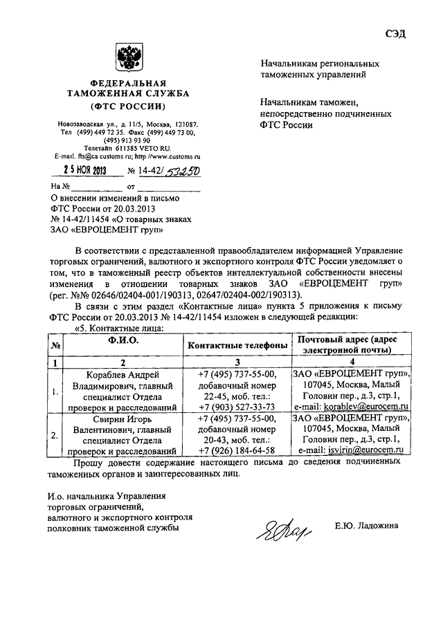 "О ВНЕСЕНИИ ИЗМЕНЕНИЙ В ПИСЬМО ФТС РОССИИ ОТ 20.03.2013 N 14-42/11454 "О ТОВАРНЫХ ЗНАКАХ ЗАО "ЕВРОЦЕМЕНТ ГРУП"