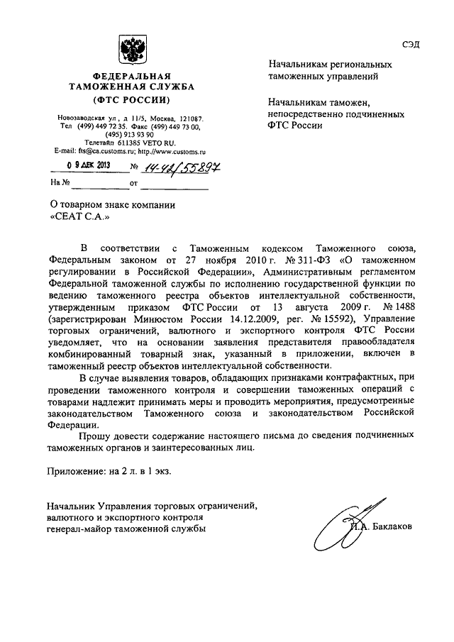 ПИСЬМО ФТС РФ от 09.12.2013 N 14-42/55897