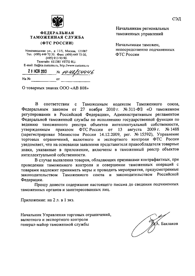 ПИСЬМО ФТС РФ от 29.11.2013 N 14-42/54446