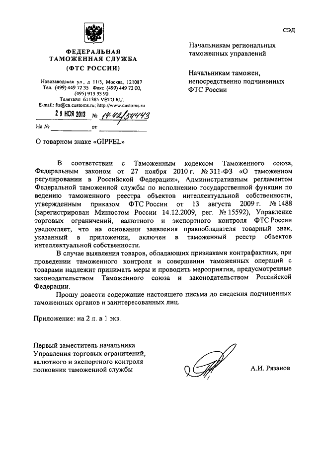 ПИСЬМО ФТС РФ от 29.11.2013 N 14-42/54443