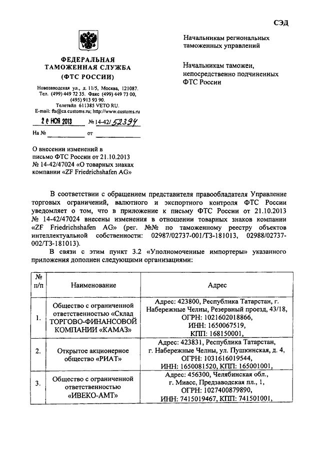 "О ВНЕСЕНИИ ИЗМЕНЕНИЙ В ПИСЬМО ФТС РОССИИ ОТ 21.10.2013 N 14-42/47024 "О ТОВАРНЫХ ЗНАКАХ КОМПАНИИ "ZF FRIEDRICHSHAFEN AG"