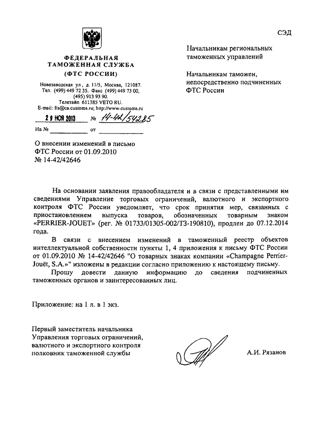 "О ВНЕСЕНИИ ИЗМЕНЕНИЙ В ПИСЬМО ФТС РОССИИ ОТ 01.09.2010 N 14-42/42646"