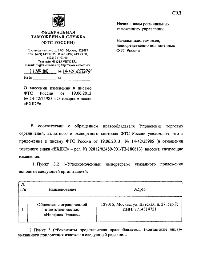 "О ВНЕСЕНИИ ИЗМЕНЕНИЙ В ПИСЬМО ФТС РОССИИ ОТ 19.06.2013 N 14-42/25985 "О ТОВАРНОМ ЗНАКЕ "EXIDE"