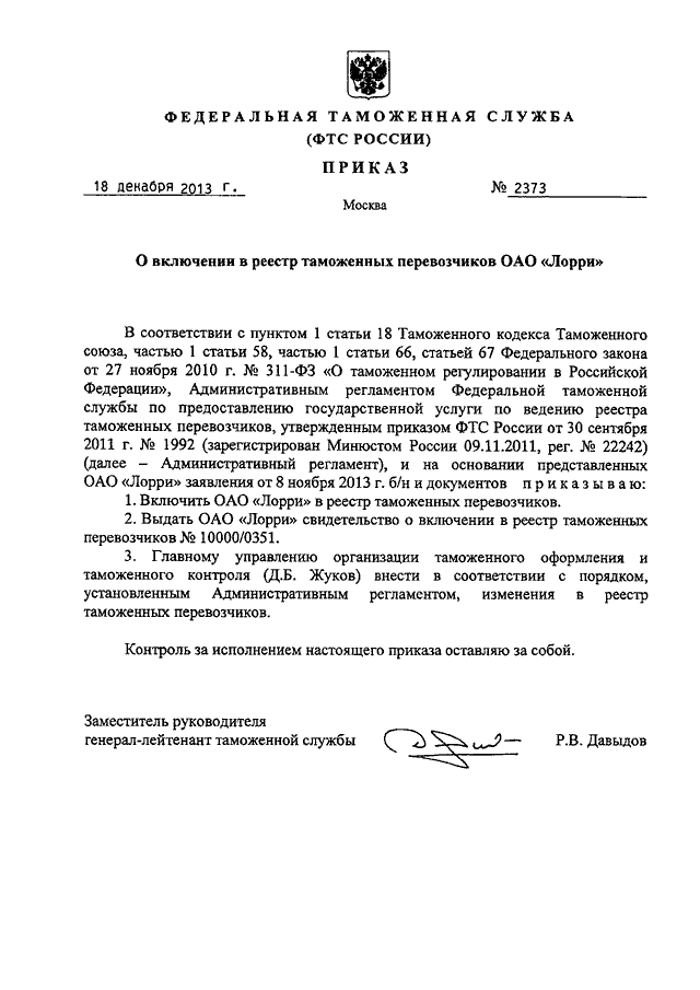 ПРИКАЗ ФТС РФ от 18.12.2013 N 2373