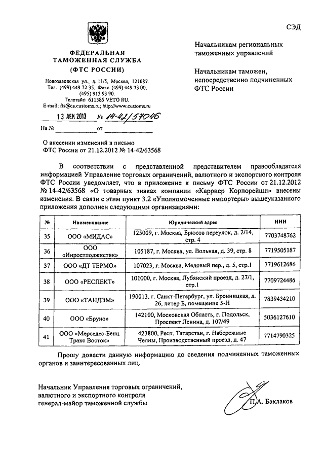 ПИСЬМО ФТС РФ от 13.12.2013 N 14-42/57046
