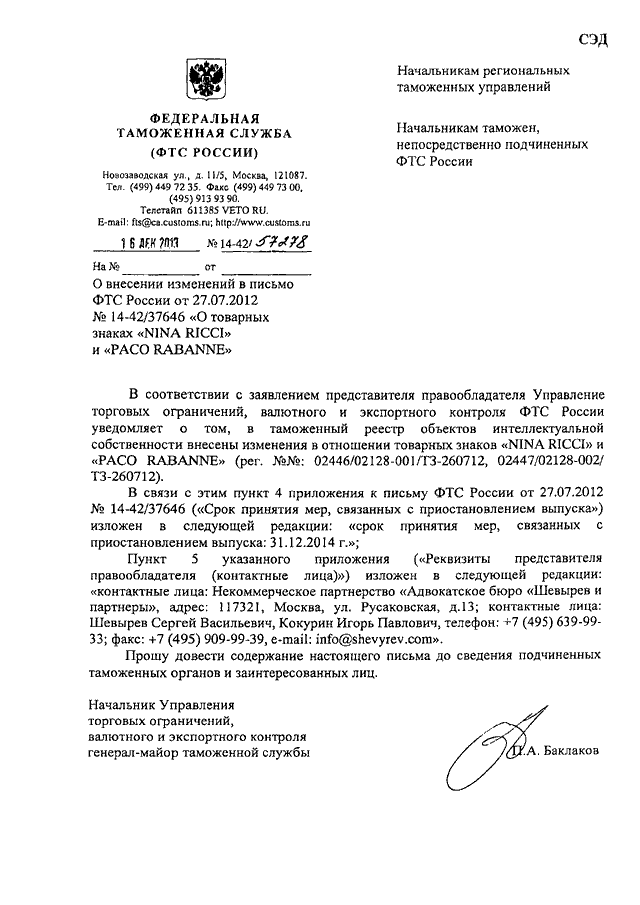 "О ВНЕСЕНИИ ИЗМЕНЕНИЙ В ПИСЬМО ФТС РОССИИ ОТ 27.07.2012 N 14-42/37646 "О ТОВАРНЫХ ЗНАКАХ "NINA RICCI" И "PACO RABANNE"